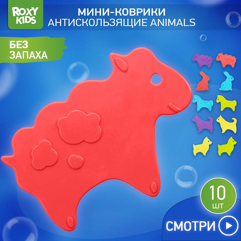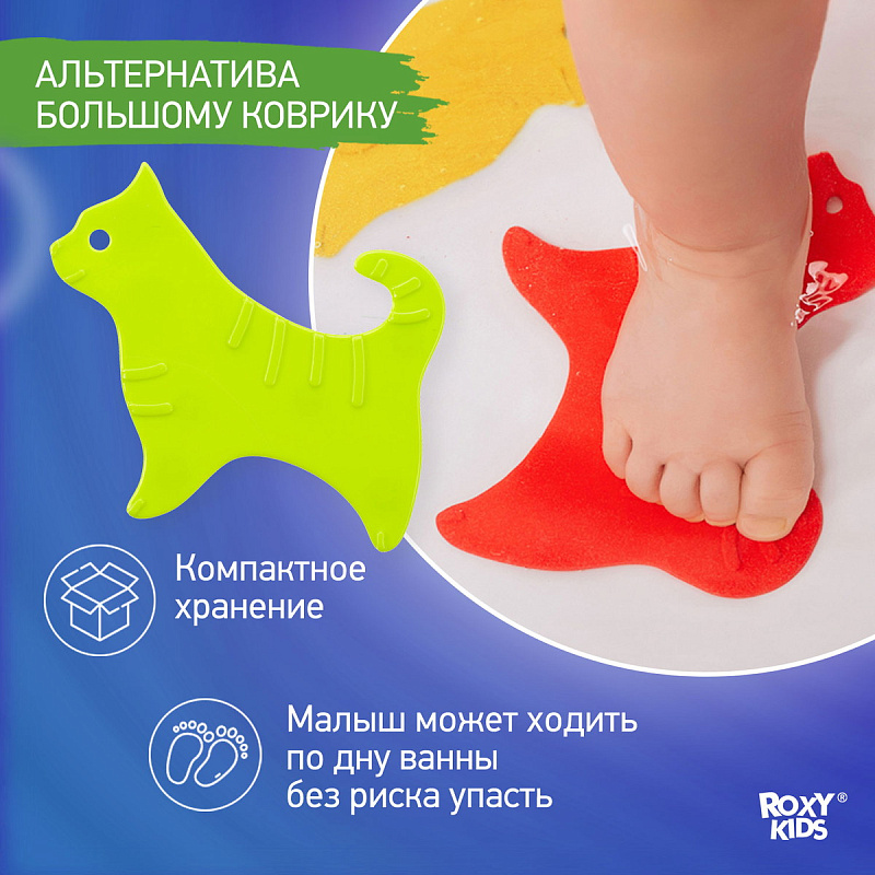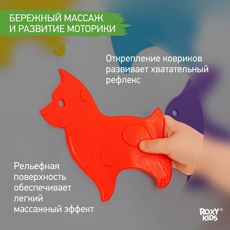 Мини коврики для ванной ANIMALS от ROXY-KIDS произведены в России из современного и безопасного материала ТЭП. Этим коврикам можно найти множество применений. Мини-коврики станут отличной заменой большому коврику, который неудобно промывать и сушить. Также их используют как массажеры, потому что рельефная поверхность обеспечивает бережный массаж стоп и ладоней. Ребенок может грызть их, потому что они изготовлены из специального безопасного материала. Ими можно также украсить интерьер, налепив коврики на дно и стенки ванны или кафель, чтобы не только обеспечить удобство, но и расставить яркие цветовые акценты. Кроме того, эти мини-коврики абсолютно не пахнут, потому что не содержат ПВХ. Для ухода их достаточно просто периодически промывать с мылом, полоскать и хорошо сушить. Они легко и надежно крепятся с помощью присосок на любую гладкую поверхность, при этом не оставляют следов. В ассортименте есть несколько наборов ковриков.