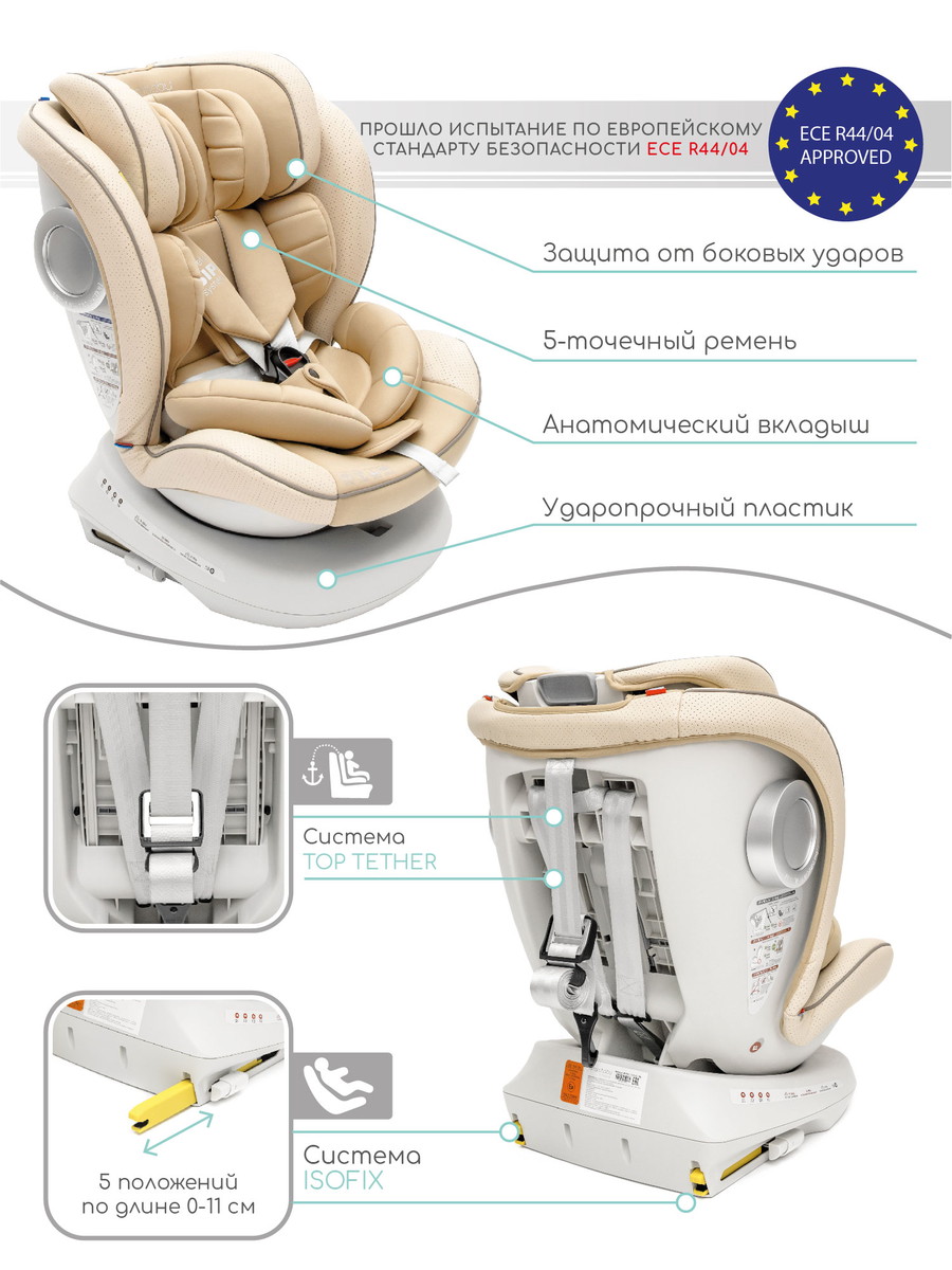 - Автокресло оснащено 5-точечным ремнем безопасности и якорной системой крепления Top Tether