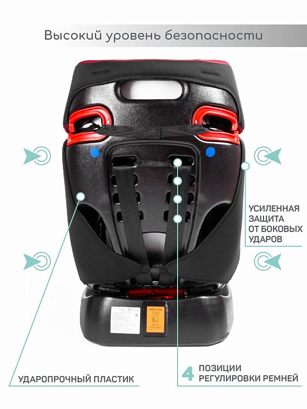 - 4 позиции регулировки ремней дает возможность адаптировать кресло под зимнюю и летнюю одежду ребенка, предупреждая чрезмерное давление, контролируя свободное пространство под ремнями