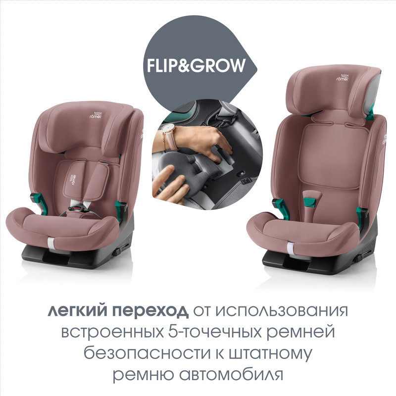 Благодаря функции FLIP&GROW, по мере роста ребенка вы можете перейти от использования встроенного 5-точечного ремня безопасности к использованию 3-точечного ремня безопасности автомобиля. А поскольку нет необходимости снимать какие-либо детали автокресла, перевод кресла из одной группы в другую будет очень прост и удобен.