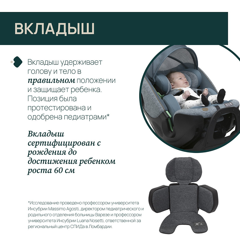 Для детей с рождения чаша кресла монтируется на базу ISOFIX Chicco Full 360 только в положении против хода движения, малыш при этом удерживается с помощью встроенных пятиточечных ремней безопасности с мягкими накладками.