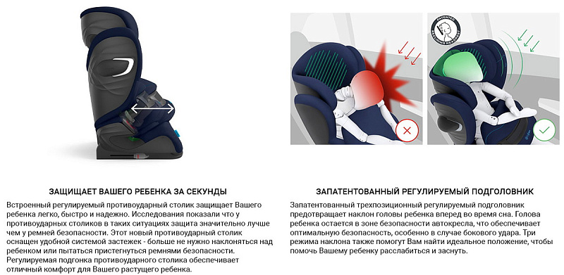 Запатентованный наклонный подголовник является функцией пассивной безопасности от CYBEX. Если ваш ребенок бодрствует, вы можете установить угол наклона подголовника в вертикальное положение, а когда он спит, вы можете установить угол наклона в наклонное положение. Это предотвращает наклон головы ребенка вперед в уязвимое положение во время сна и сохраняет ее в семь раз безопаснее.