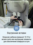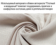 Материал чехла автокресла изготовлен из гипоаллергенных дышащих тканей, обеспечивающих комфорт малышу даже в жаркую погоду. Внутренняя набивка выполнена из экологически чистых материалов, обеспечивающих мягкость и поддержку спины и шеи ребёнка. Защитные элементы включают встроенные боковые протекторы и мягкие накладки, смягчающие удары сбоку и спереди, повышая уровень безопасности при аварии.