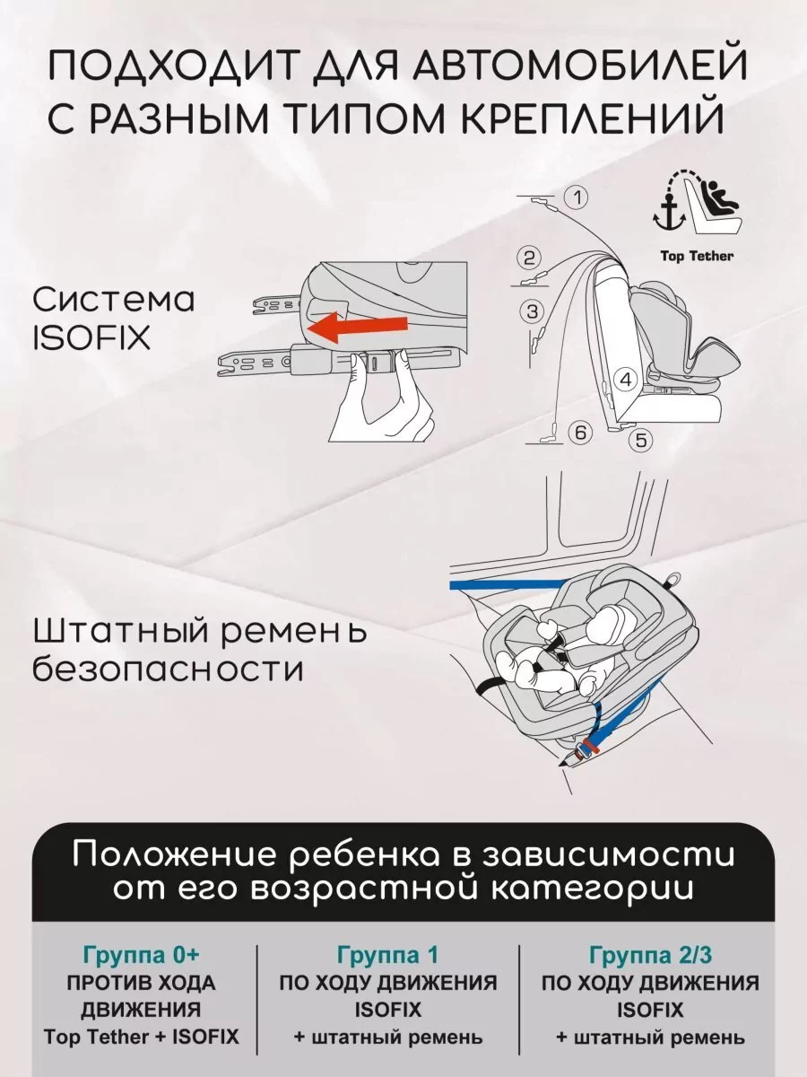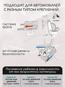 Кресло детское автомобильное можно установить с помощью системы креплений Isofix, или штатными автомобильными ремнями. Крепления FIX оснащены цветовыми индикаторами (9 положений).