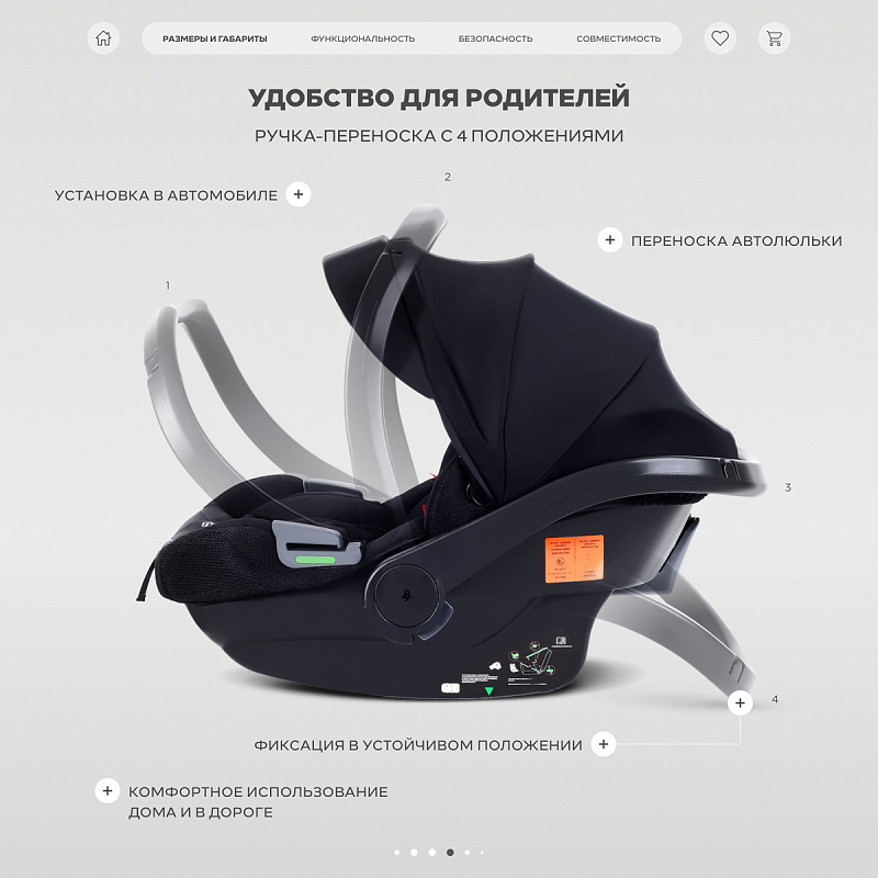 удобная ручка-переноска регулируется в нескольких положениях. В нижнем положении ручка выступает стопором, предотвращающим укачивание.