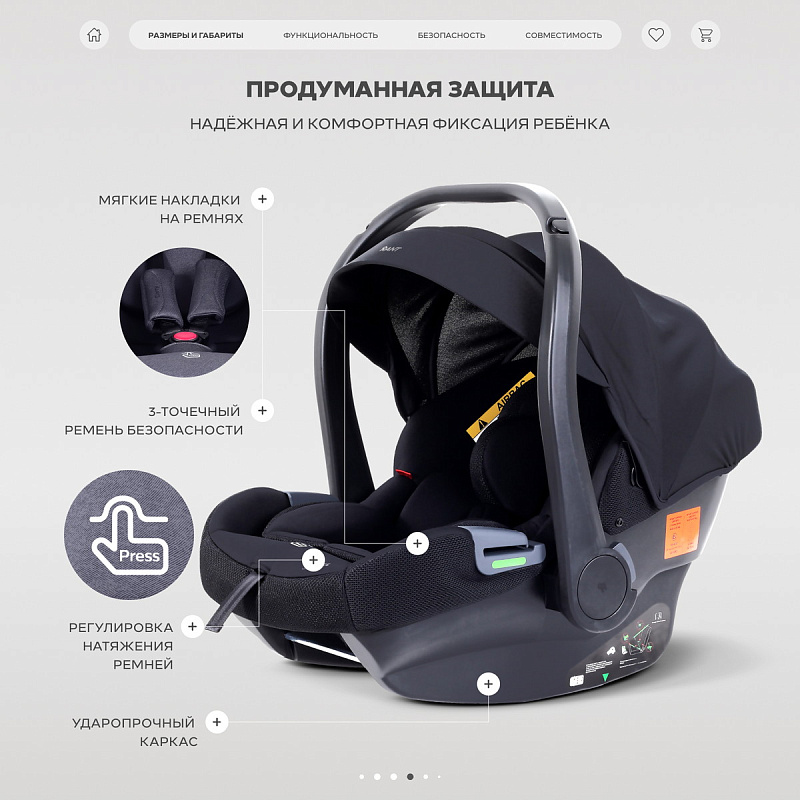 3-точечные ремни обеспечат полную безопасность, а плечевые накладки не дадут выскользнуть малышу при ударе