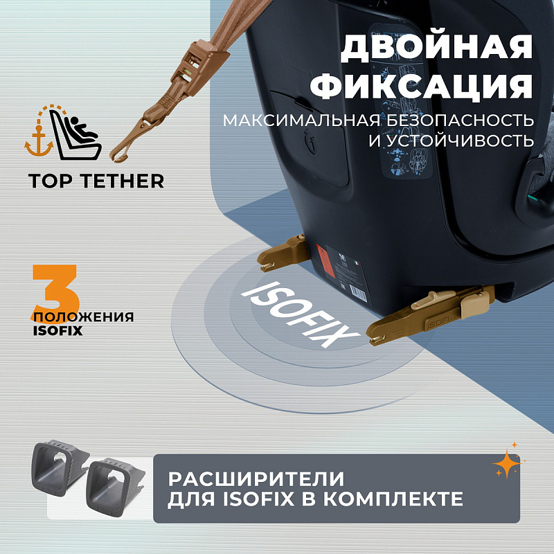 - Якорный ремень Top Tether и направляющие Isofix обеспечивают простую и безопасную установку, фиксируя кресло в автомобиле максимально надежно.
