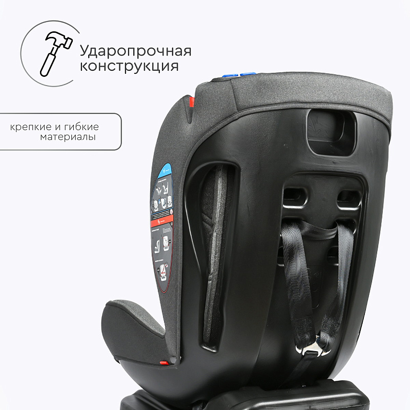 Прочный каркас автокресла изготовлен методом литья под давлением, металлические направляющие предотвращают смещение кресла с базы при столкновении.