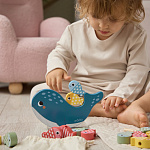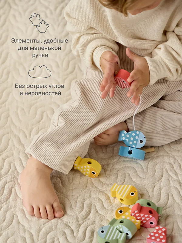 - Игра 3-в-1 — сочетает игру на баланс и шнуровку. А пока ребёнку сложно нанизывать, набор работает как сортер, где рыбки можно считать и сортировать по цветам и рисункам.