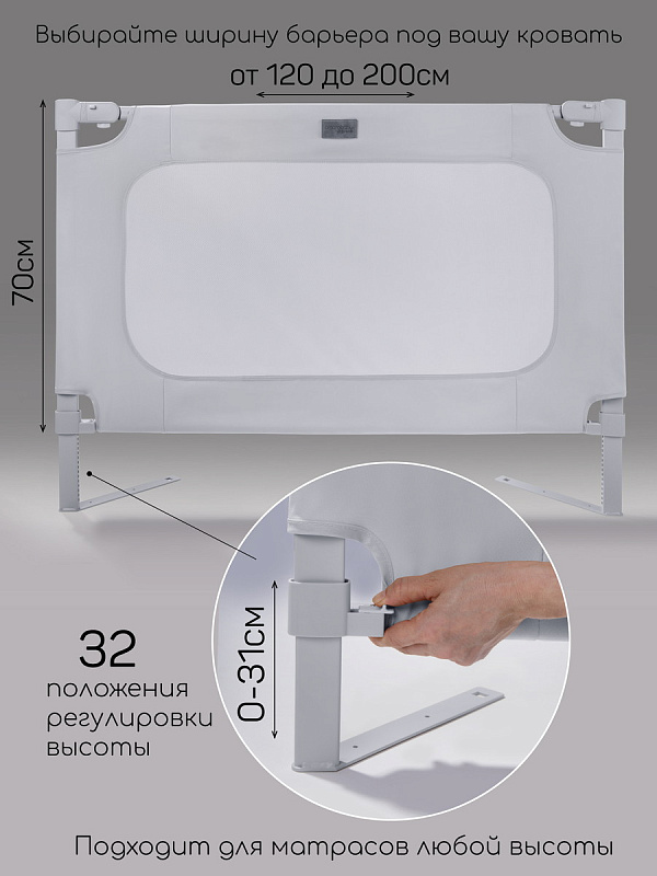 Барьер для кровати Amarobaby Caveo — безопасность и комфорт для вашего малыша! Защитите ребенка от случайного падения с кровати с надежным детским барьером Amarobaby Caveo — идеальным решением для родителей, которые ценят простоту, качество и безопасность. Защитный барьер легко устанавливается за минуты, устойчив к раскачиванию даже при активных движениях малыша, оснащен прочной сеткой и приятной на ощупь тканью, которая не шуршит и не разбудит вашего малыша. Верхняя планка барьера защищена мягким материалом. Надежное крепление и усиленный стальной каркас гарантируют устойчивость, а опущенный бортик не мешает удобно сесть на кровать. Ножки барьера регулируются по высоте и идеально подстраиваются под высоту вашего матраса. Перегородка для детей обеспечит спокойствие вам и защиту ребенку. Защитное ограждение для новорожденных устанавливается под матрас и крепится к каркасу кровати. Модель универсальна, подойдет для мальчиков и девочек. Барьер для детей выполнен в универсальных цветах, подойдет в любой интерьер.