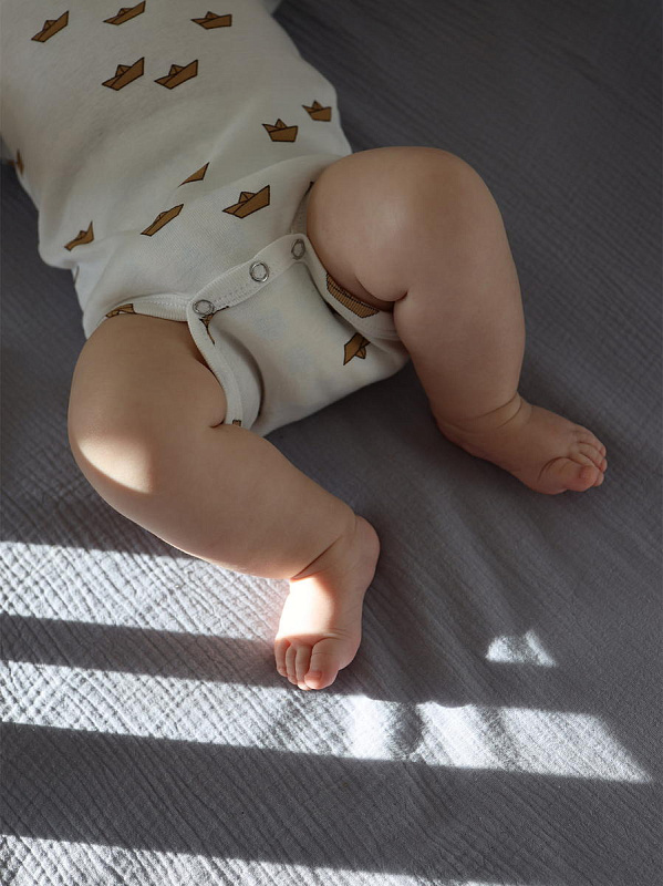 Боди Mjölk [мьёльк] Бумажные кораблики с коротким рукавом выполнен из тонкого 100% трикотажного хлопка. Плетение нитей в этой ткани менее плотное, чем у другой одежды из нашей коллекции, что позволяет комфортно использовать боди в качестве первого слоя.