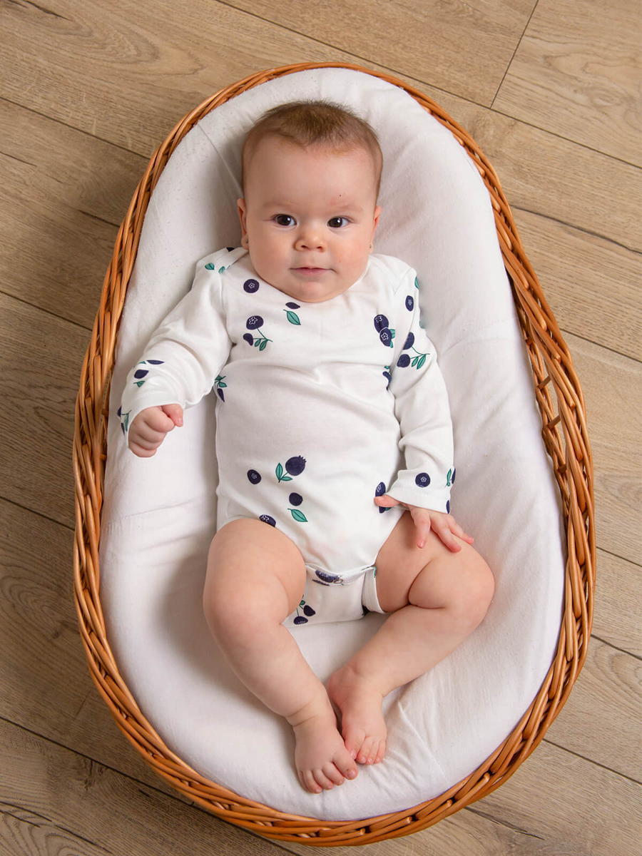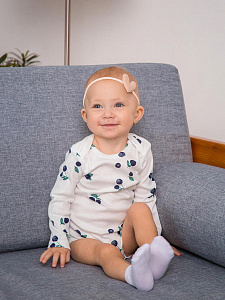 Боди Mjölk [мьёльк] растягивается по фигуре, ребёнку в нём не жарко, он не потеет. В такой одежде можно играть и спать круглый год, поддевать её под комбинезон или спальный мешок. Материал приятный на ощупь, эластичный, гигроскопичный, "дышит" и не вызывает аллергии. Кнопки расположены значительно выше их привычного месторасположения, что облегчает застёгивание изделия на малыше. В сопутствующих товарах можно подобрать изделия в комплект с таким же принтом: мягкую шапочку с узелком, двусторонний плед, сет пелёнок в тон или яркий комбинезон.