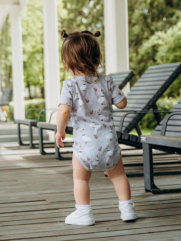 Боди Mjölk [мьёльк] Гуси с коротким рукавом выполнен из тонкого 100% трикотажного хлопка. Плетение нитей в этой ткани менее плотное, чем у другой одежды из нашей коллекции, что позволяет комфортно использовать боди в качестве первого слоя.