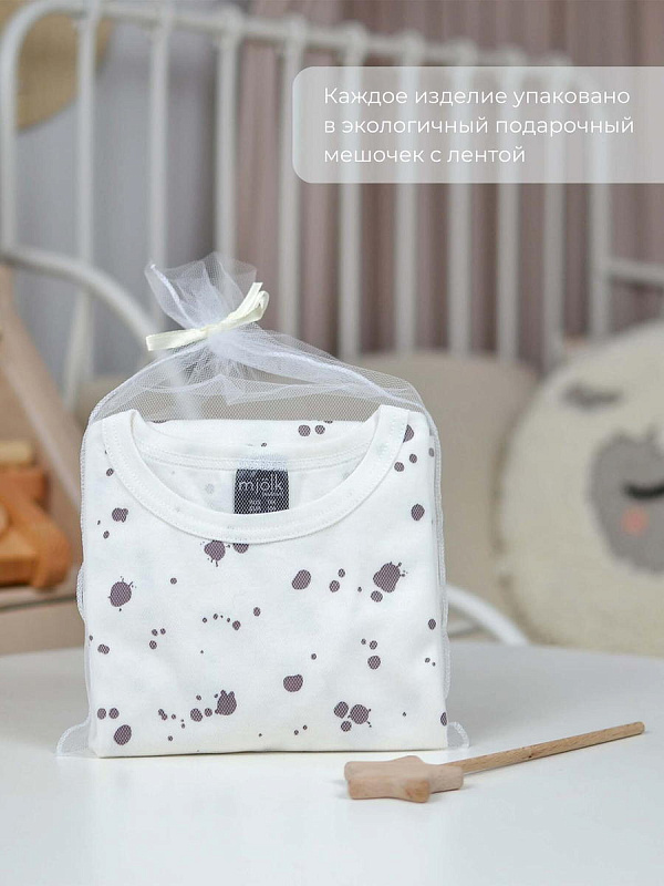 Боди Mjölk [мьёльк] Кляксы с коротким рукавом выполнен из тонкого 100% трикотажного хлопка. Плетение нитей в этой ткани менее плотное, чем у другой одежды из нашей коллекции, что позволяет комфортно использовать боди в качестве первого слоя.