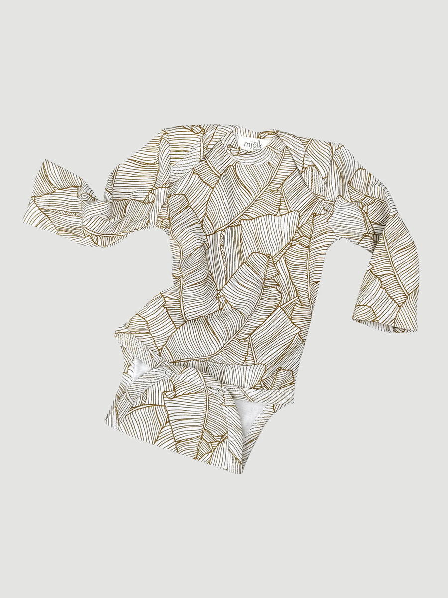 Боди Mjölk [мьёльк] Palm Tree с длинным рукавом выполнен из тонкого 100% трикотажного хлопка. Плетение нитей в этой ткани менее плотное, чем у другой одежды из нашей коллекции, что позволяет комфортно использовать боди в качестве первого слоя.