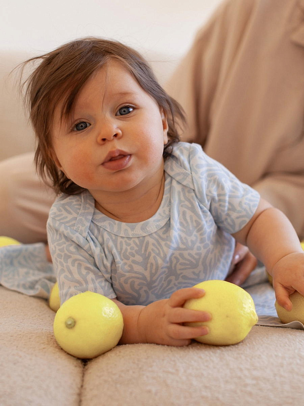 Боди Mjölk [мьёльк] растягивается по фигуре, ребёнку в нём не жарко, он не потеет. В такой одежде можно играть и спать круглый год, поддевать её под комбинезон или спальный мешок. Материал приятный на ощупь, эластичный, гигроскопичный, дышит и не вызывает аллергии. Кнопки расположены значительно выше их привычного месторасположения, что облегчает застёгивание изделия на малыше.