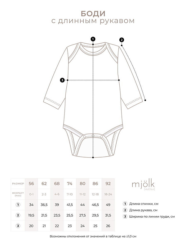 Боди Mjölk [мьёльк] растягивается по фигуре, ребёнку в нём не жарко, он не потеет. В такой одежде можно играть и спать круглый год, поддевать её под комбинезон или спальный мешок. Материал приятный на ощупь, эластичный, гигроскопичный, "дышит" и не вызывает аллергии. Кнопки расположены значительно выше их привычного месторасположения, что облегчает застёгивание изделия на малыше. В сопутствующих товарах можно подобрать изделия в комплект с таким же принтом: мягкую шапочку с узелком, двусторонний плед, сет пелёнок в тон или яркий комбинезон.