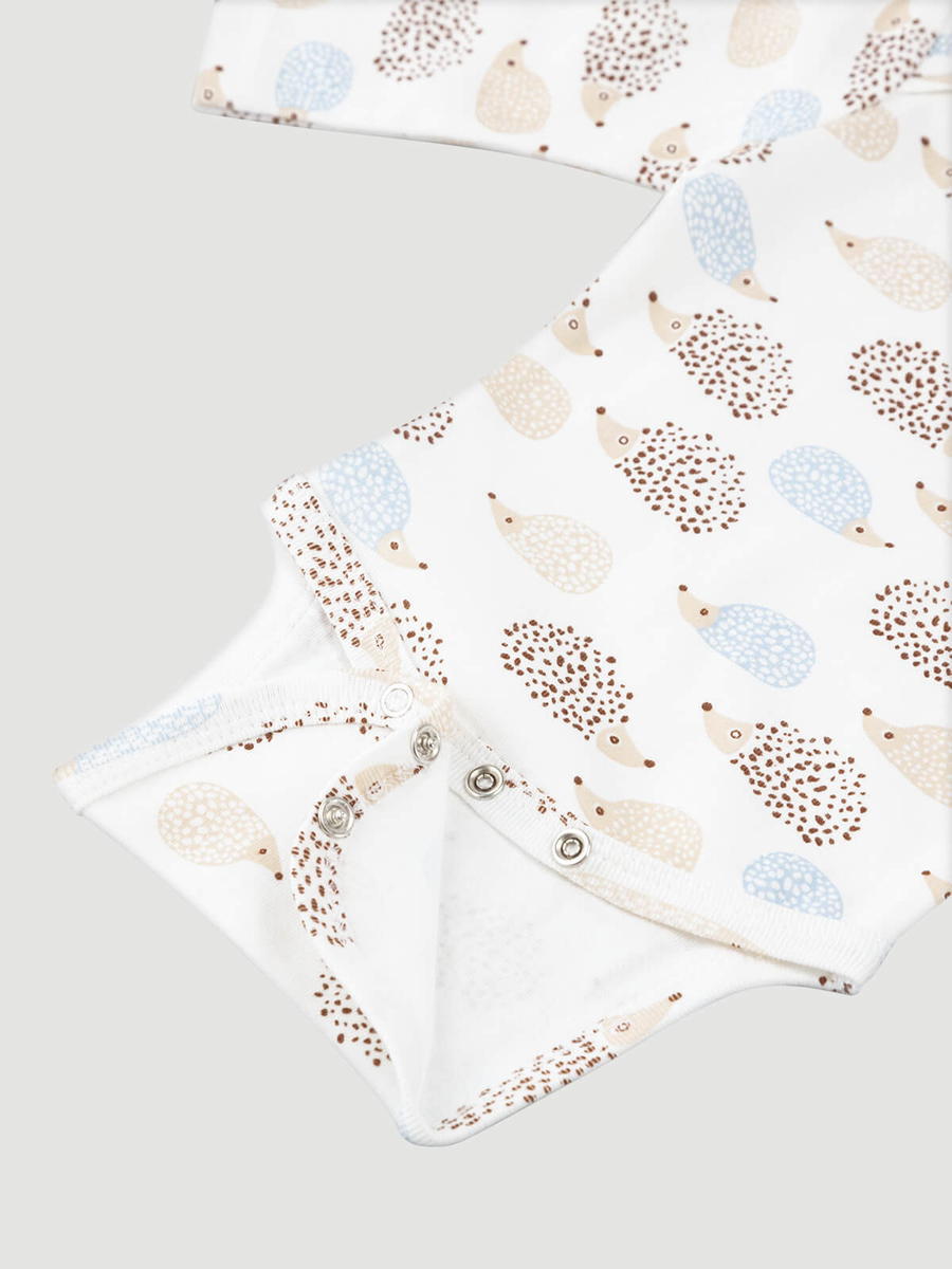 Боди Mjölk [мьёльк] Ёжики с длинным рукавом выполнен из тонкого 100% трикотажного хлопка. Плетение нитей в этой ткани менее плотное, чем у другой одежды из нашей коллекции, что позволяет комфортно использовать боди в качестве первого слоя.