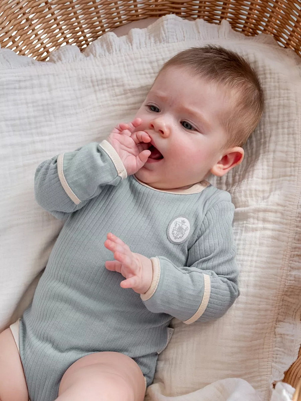 Боди с длинным рукавом выполнен из мягкого хлопка. Модель застегивается на кнопки на плече. На рукавах предусмотрены антицарапки.