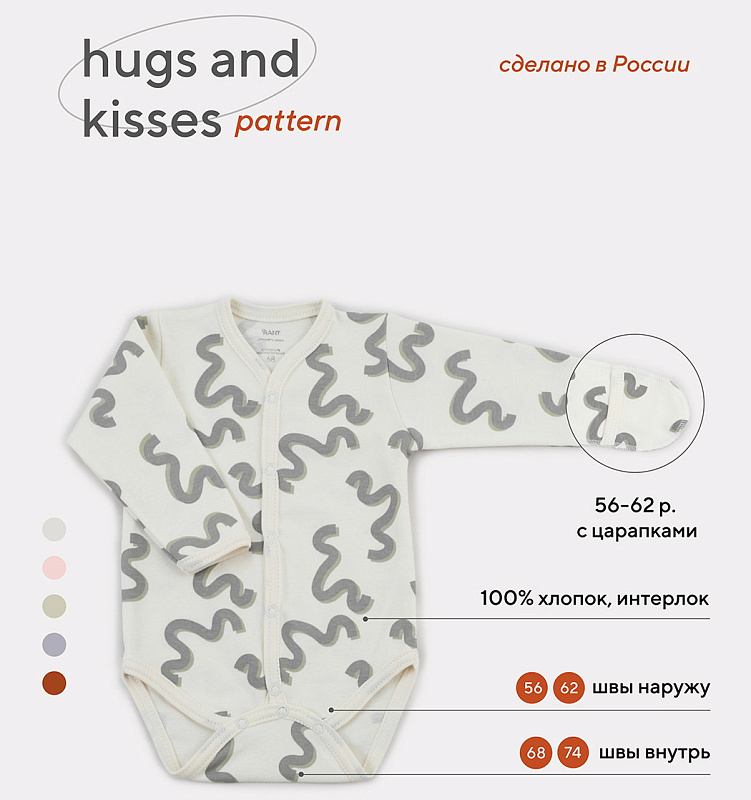 - Свежая коллекция Hugs and kisses Pattern покажет вашу нежность и заботу. Отдельного внимания заслуживают абстрактные принты, с любовью разработанные нашими дизайнерами. Прибавьте к этому лаконичный стиль, актуальные цвета, качественную фурнитуру в тон и хлопок премиум класса (интерлок-пенье)