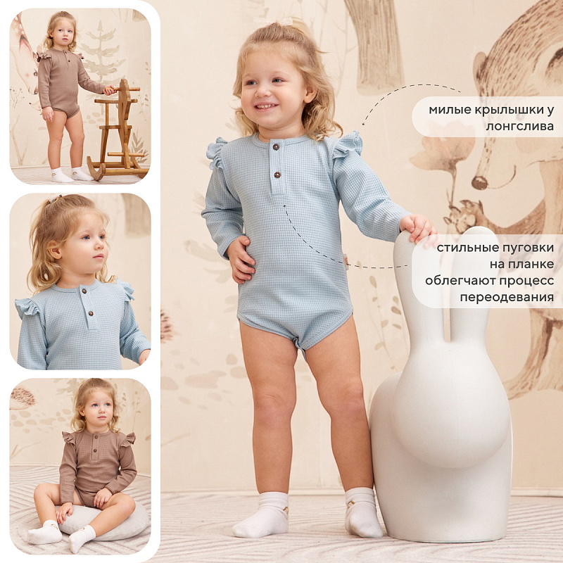 Боди из этой коллекции станут самыми практичными предметами гардероба вашего крохи. Застежка-поло на 3 пуговицы облегчит процесс переодевания малыша, а кнопочки внизу изделия позволят без труда сменить подгузник. Для маленьких модниц предусмотрены модели с очаровательными крылышками. Боди идеально подойдут для прогулок, путешествий и запоминающихся фотосессий.