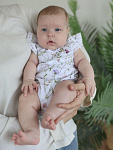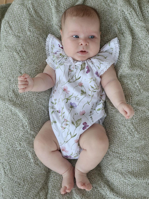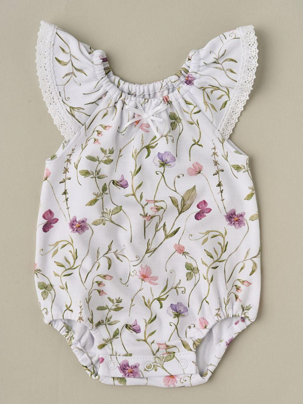 Боди с крыльями выполнен из нежного хлопка, с коротким рукавом. Модель имеет рукава с крыльями и широкую головину, за счет которой может одеваться как через голову, так и через ножки.