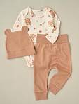 Боди застёгивается на удобные кнопки по низу, что облегчает переодевание и смену подгузников. Штанишки с мягким широким поясом не сдавливают животик, а шапочка с милыми «ушками» завершает образ.