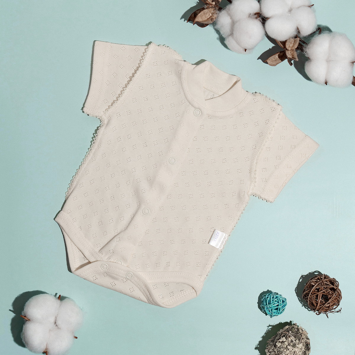 Классическая модель с короткими рукавами и застёжкой на левом плече и внизу позволит быстро сменить подгузник, не снимая изделие полностью.