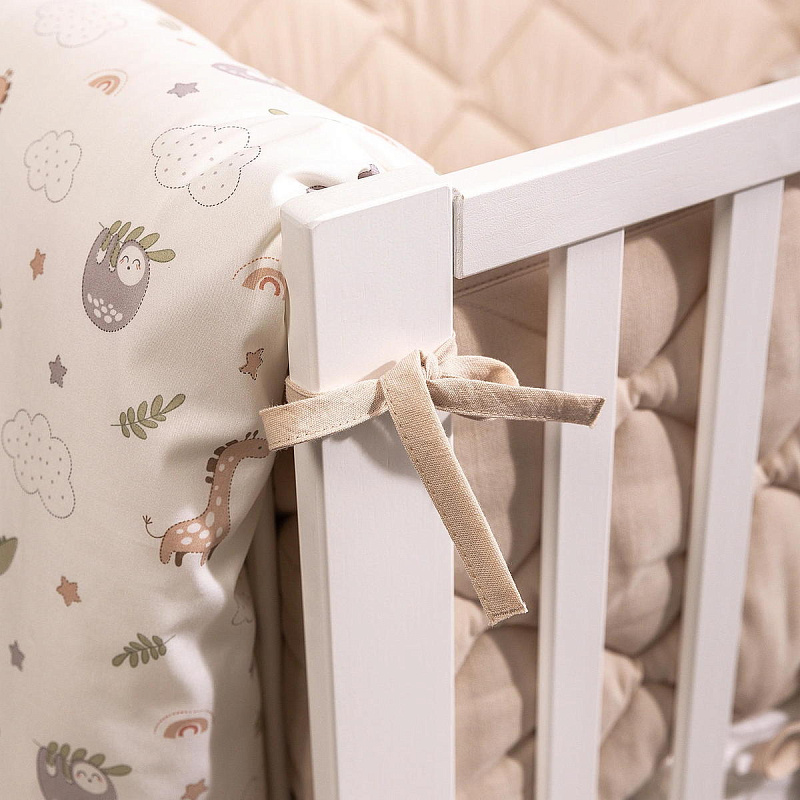 Стеганая структура делает бортики плотными и упругими, но при этом гибкими, чтобы легко принять нужную форму по периметру кроватки. Они хорошо защищают малыша от сквозняков, застреваний, случайных ударов и создают уютную атмосферу для спокойного сна.