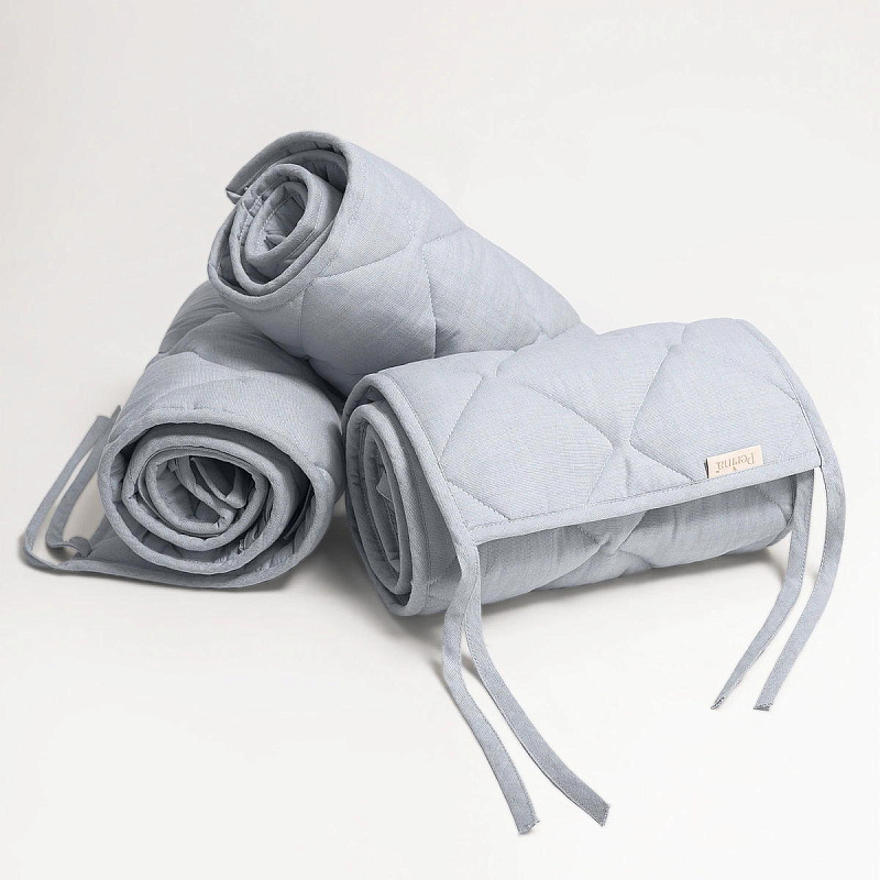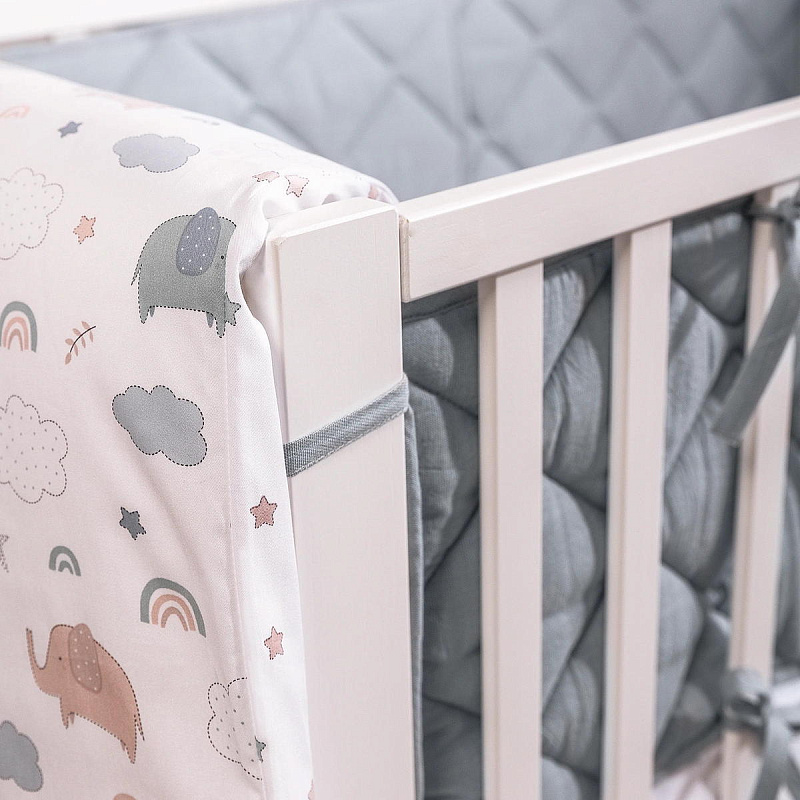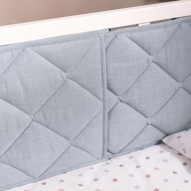 Стеганая структура делает бортики плотными и упругими, но при этом гибкими, чтобы легко принять нужную форму по периметру кроватки. Они хорошо защищают малыша от сквозняков, застреваний, случайных ударов и создают уютную атмосферу для спокойного сна.