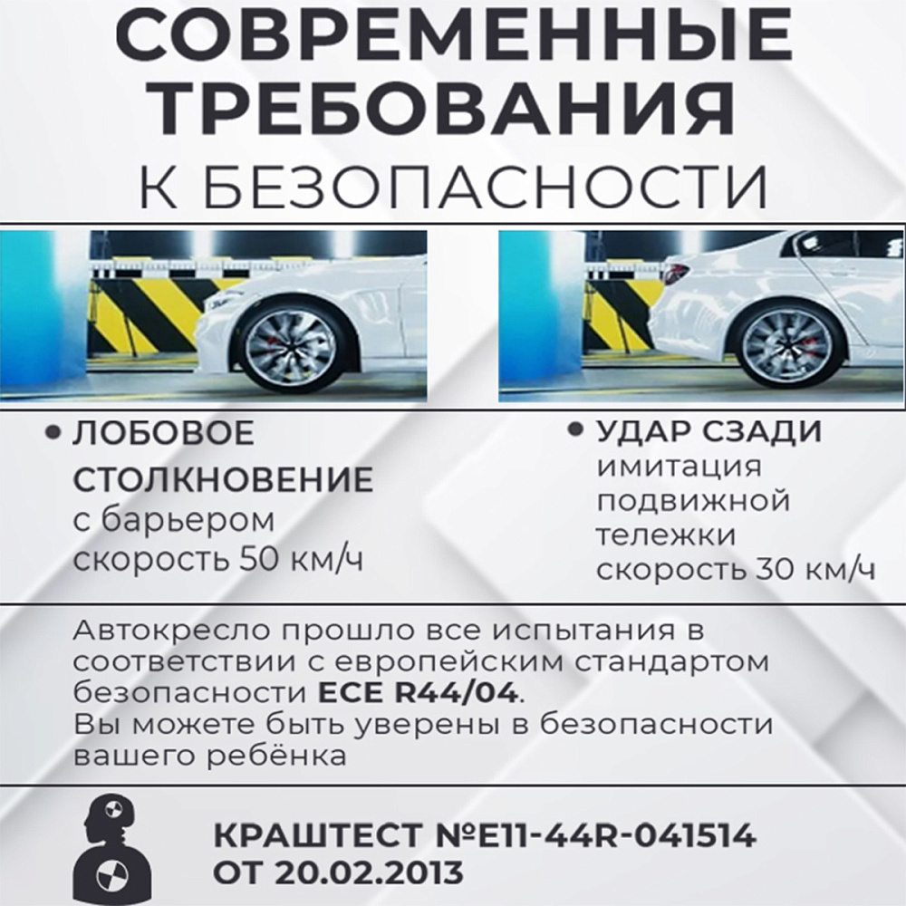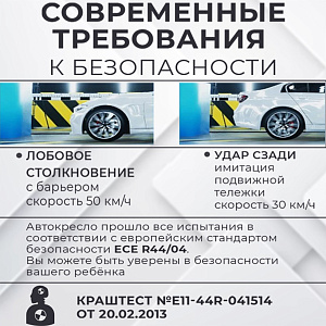• Соответствует стандарту безопасности ECE R44/04. Автокресло отлично показало себя при краш-тестах - при фронтальном и боковом столкновении.