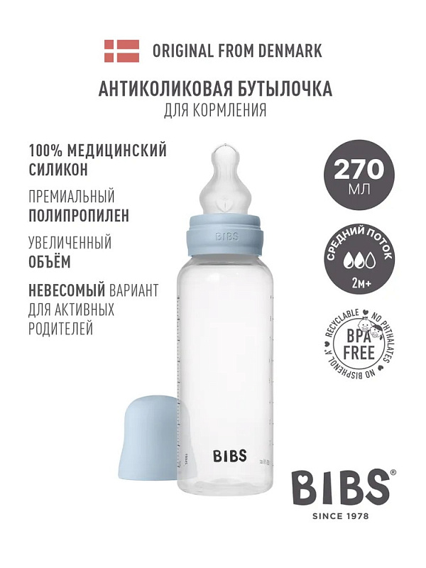 Бутылочка для кормления Bibs с силиконовой соской, средний поток, 270 мл 50171231 Baby BlueНет оценокХарактеристики