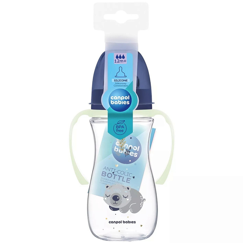 Антиколиковая детская бутылочка для кормления 300 мл новорожденных детей от 12 месяцев Canpol babies коллекции Sleepy Koala была создана специально для детей. Гарантия легкого начала грудного вскармливания - бутылка для воды, смеси и молока позволяет сочетать грудное вскармливание и кормление из бутылочки. Эффективный антиколиковый клапан предотвращает образование пузырьков воздуха в пище, спасает от коликов и чрезмерного скопления газов. Широкое горлышко позволяет легко промывать и наполнять бутылочку. Ручки светятся в темноте. Бутылку можно простерилизовать в микроволновой печи. Новорожденным будет легко держать бутылочку в руках благодаря её эргономичной форме. Мягкая силиконовая соска на бутылочку из исключительно мягкого гипоаллергенного силикона не раздражает нежные десна новорожденного малыша. Имитирует грудь мамы. Она с точной и четкой мерной шкалой, что облегчает процесс приготовления пищи. Исключительно безопасные материалы. Интересный современный дизайн.