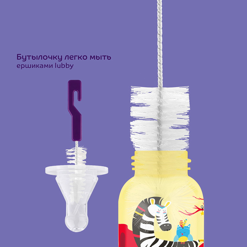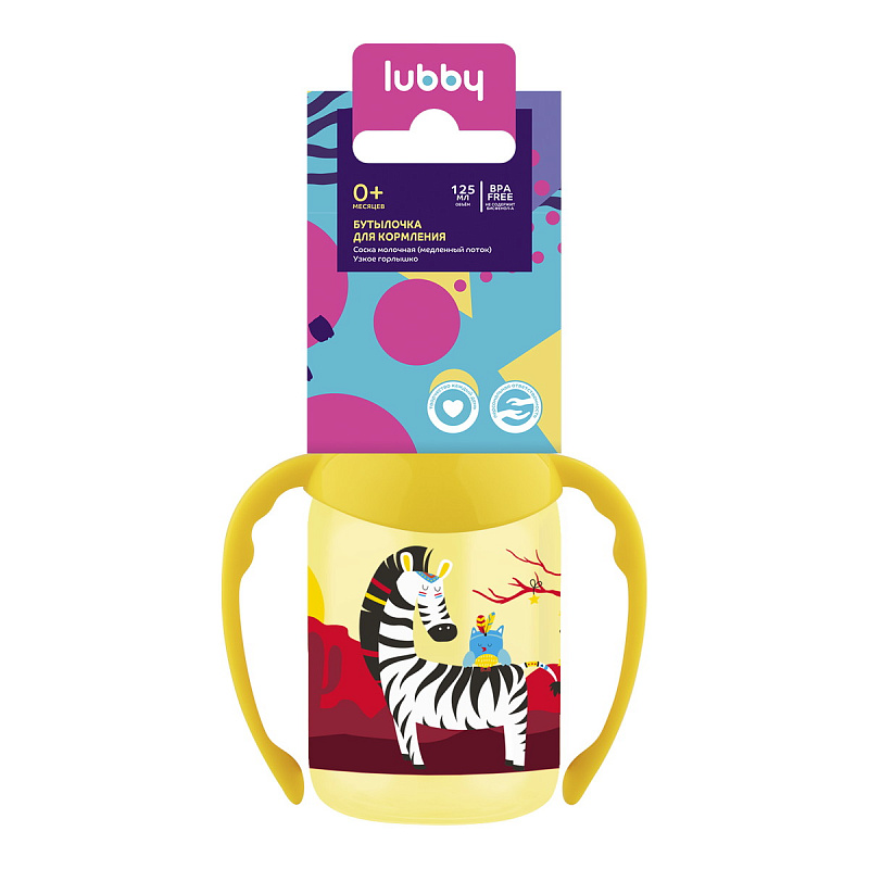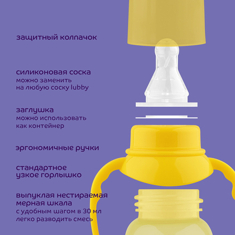 В комплект входит заглушка, позволяющая использовать бутылочку как контейнер. Благодаря ручкам ребенок может самостоятельно держать бутылочку во время кормления. При необходимости ручки можно снять. К бутылочке подходят все молочные соски lubby как латексные, так и силиконовые для бутылочек со стандартным (узким) горлышком.