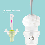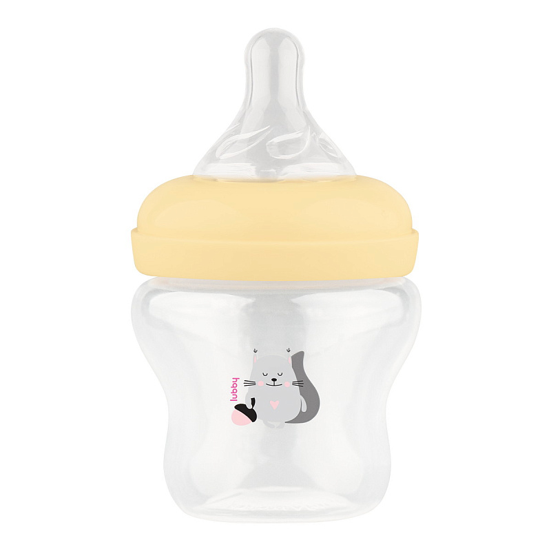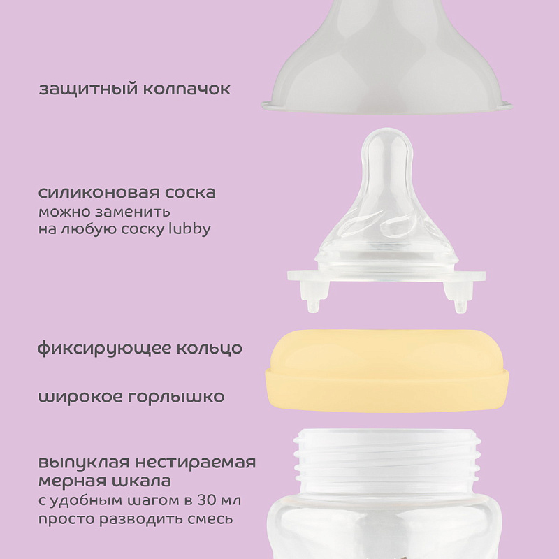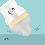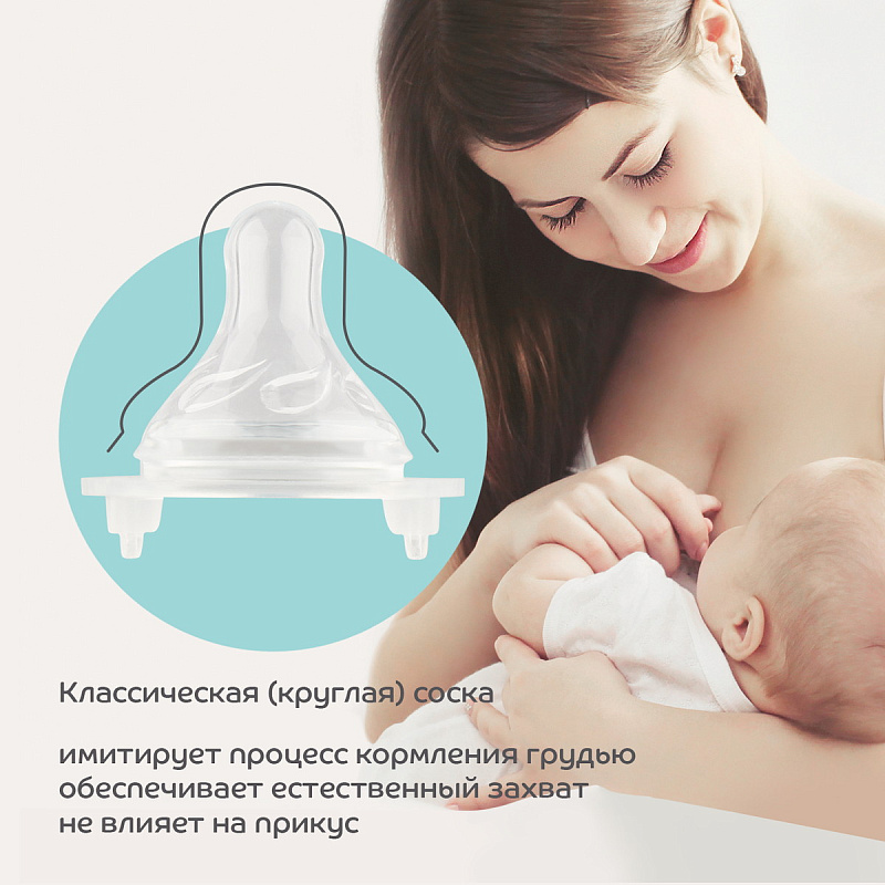Бутылочка для кормления с широким горлышком оснащена силиконовой молочной соской медленного потока. В соске имеются специальные воздухоотводные клапаны, которые препятствуют образованию вакуума и ребенок меньше заглатывает воздух. Некоторые специалисты утверждают, что заглатываемый при кормлении воздух является причиной возникновения колик у детей. Выполнена из безопасного материала -полипропилена. Такие бутылочки легкие, не бьются. Силиконовые соски упругие, что способствует развитию жевательного аппарата, не вызывают аллергию. Выпуклая, нестираемая шкала имеет удобный шаг в 30 мл. Колпачок имеет дополнительную шкалу.