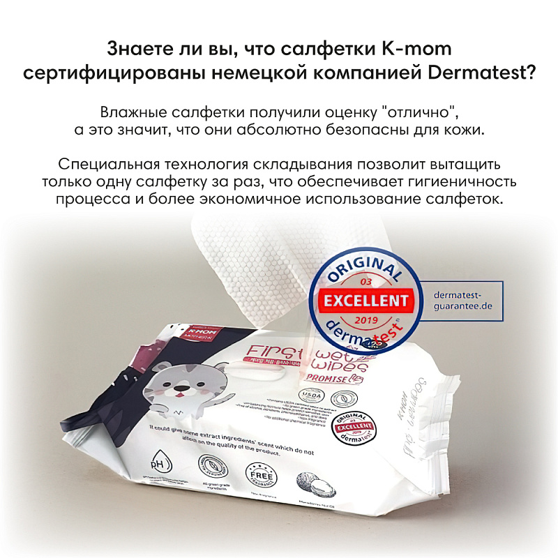Незаменимый атрибут по уходу за новорожденным - это, конечно, влажные салфетки, которые у каждой мамы должны быть всегда под рукой. Лучшим выбором будут салфетки от бренда K-MOM by Mother-K, производителя из Южной Кореи, который является одним из самых продвинутых производителей в индустрии детских товаров и занимает лидирующее место во всем мире, что подтверждают множественные награды.