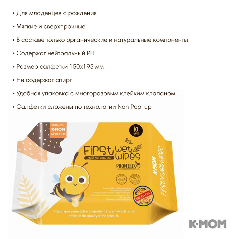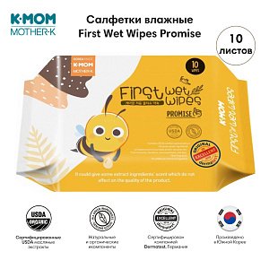 Cалфетки влажные K-MOM 10 листов 0+ First Wet Wipes Promise