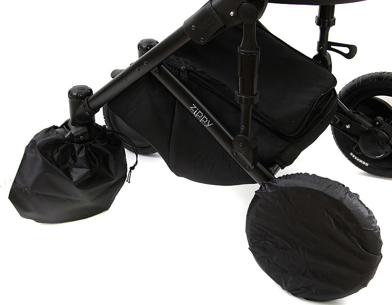 Два чехла на стандартные колёса диаметром 12 дюймов (31,5см)и два чехла -мешочка с удобными застежками на липучке на поворотные колёса.
