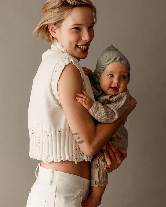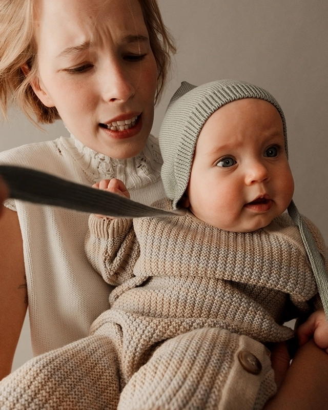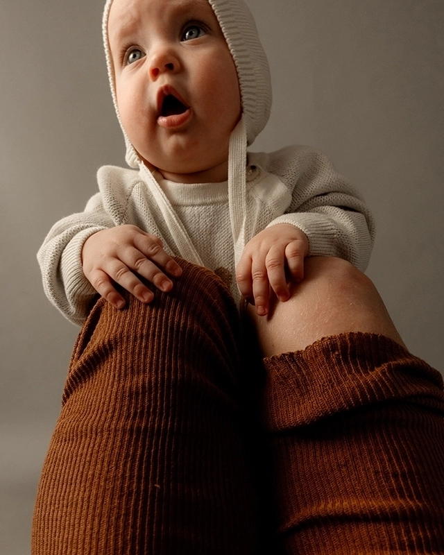 С шапочкой подружатся базовые вязаные штанишки, свитер, кардиган и комбинезон для тёплых историй из детства.