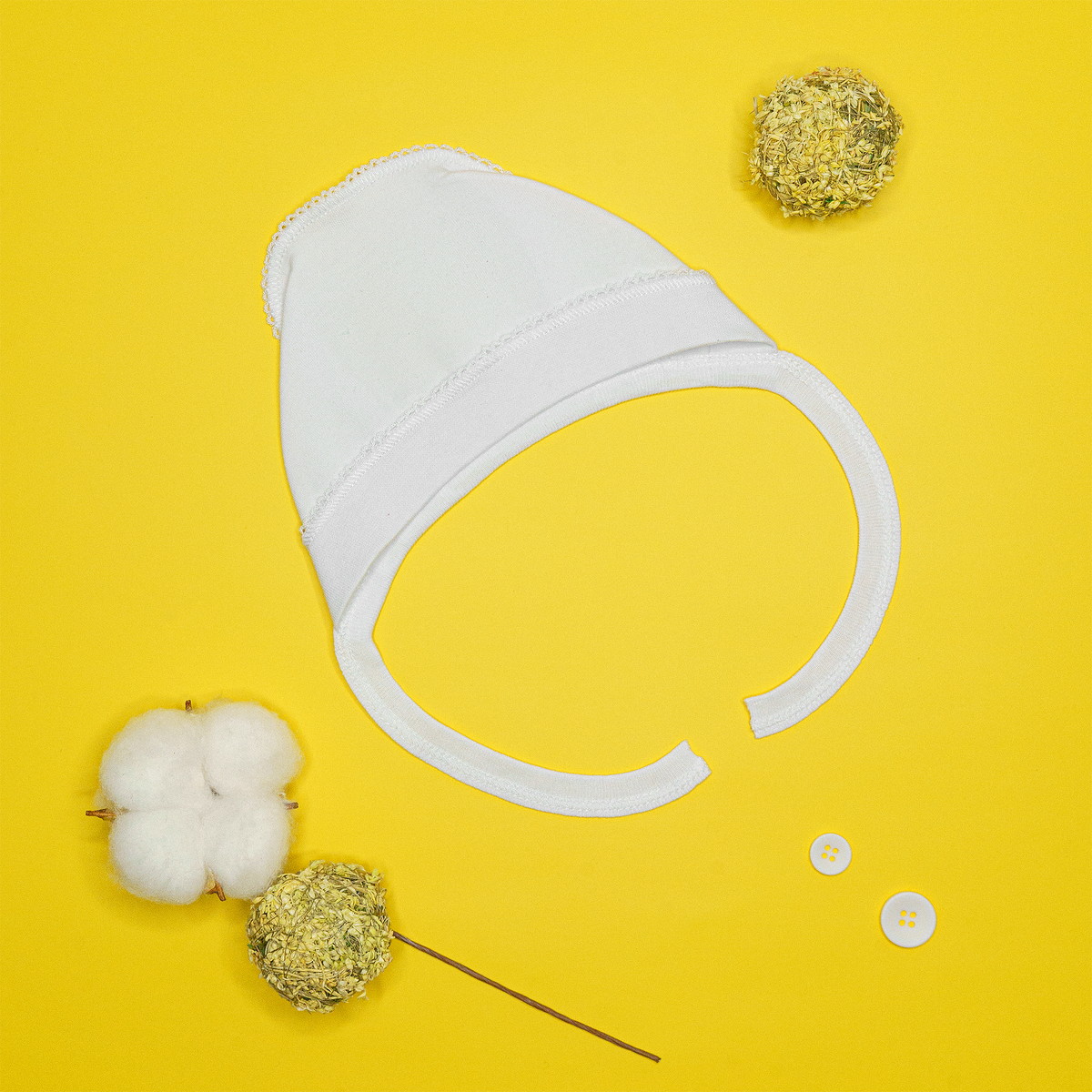 Чепчик выполнен из натуральной дышащей ткани. Модель с удобными завязочками, которые не будут натирать нежную кожу малыша. Швы наружу не придают дискомфорта. Ткань хорошо пропускает воздух благодаря натуральному составу.