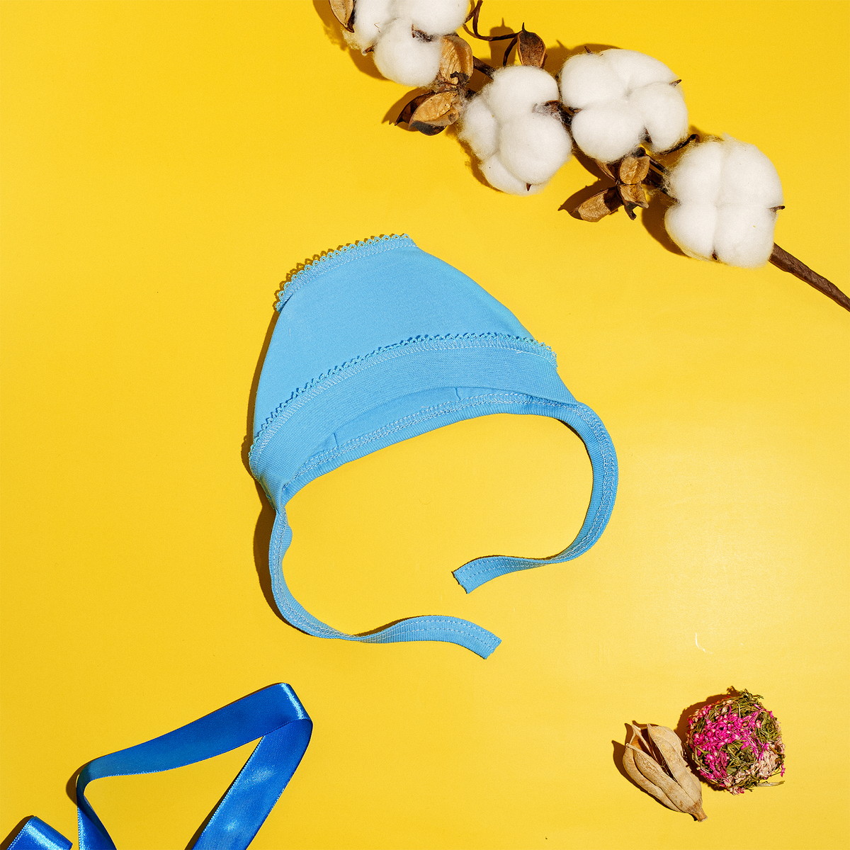 Чепчик синего цвета от бренда Vikalex изготовлен из 100% хлопка, что обеспечивает отличную воздухопроницаемость и комфорт для нежной кожи малыша.