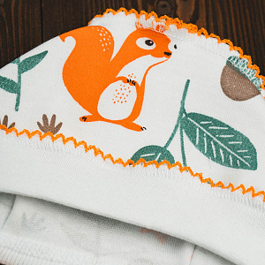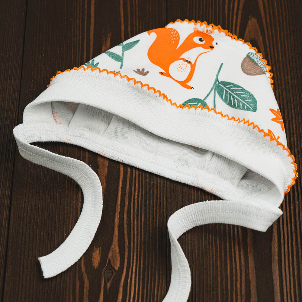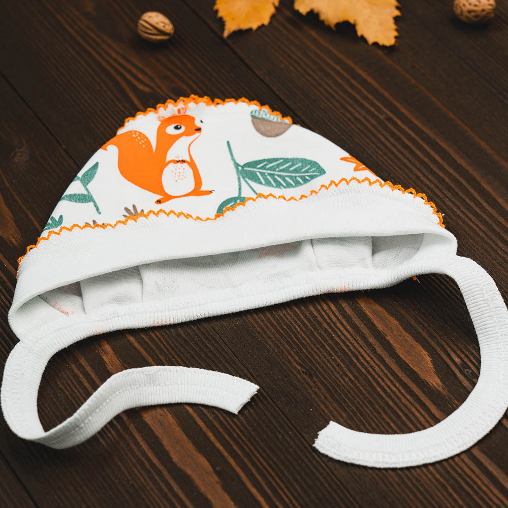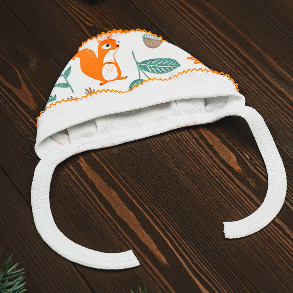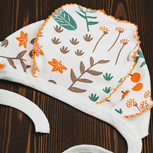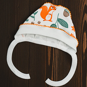 Чепчик выполнен из натуральной дышащей ткани и украшен рисунками. Модель с удобными завязочками, которые не будут натирать нежную кожу малыша. Швы наружу не придают дискомфорта. Ткань хорошо пропускает воздух благодаря натуральному составу.