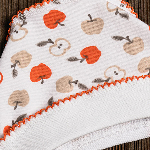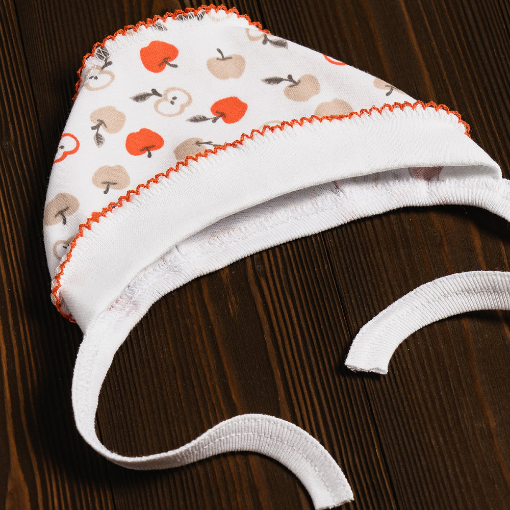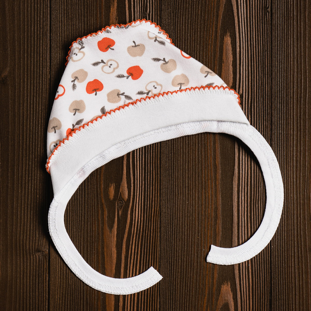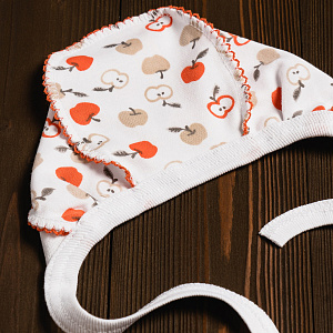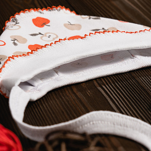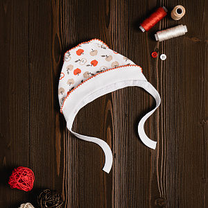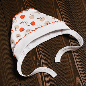 Чепчик выполнен из натуральной дышащей ткани и украшен рисунками. Модель с удобными завязочками, которые не будут натирать нежную кожу малыша. Швы наружу не придают дискомфорта. Ткань хорошо пропускает воздух благодаря натуральному составу.
