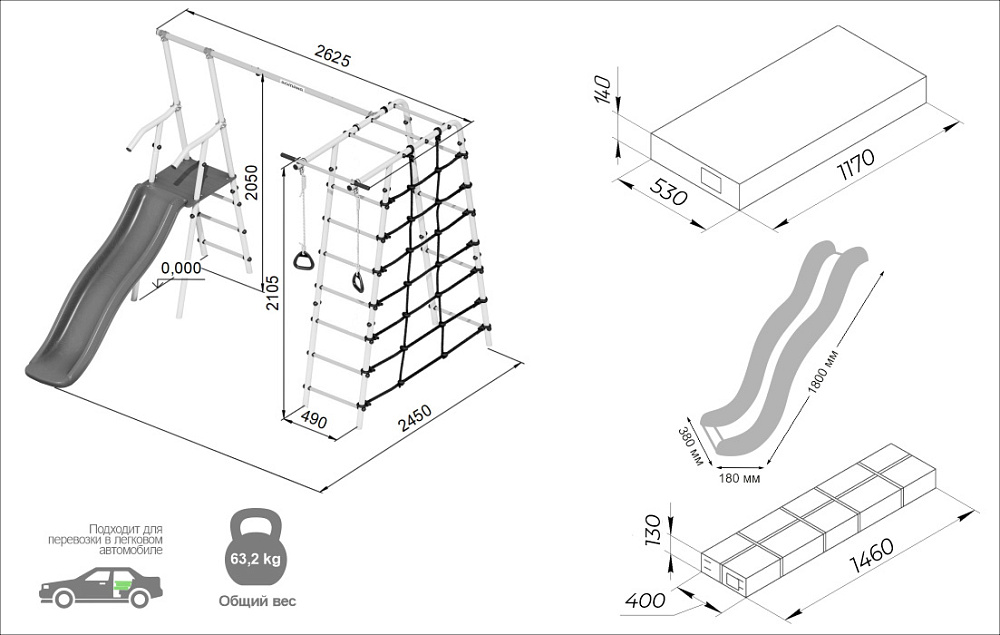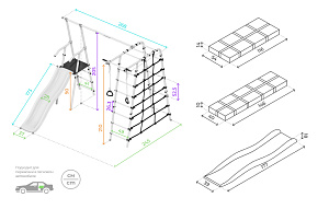 Дачный спортивный комплекс нового поколения ROMANA «Богатырь» — настоящая находка для активных и подвижных детей. Прекрасное приобретение для дачи или загородного дома. Маленький искатель приключений будет просто в восторге, а родители cмогут любоваться как малыш растет, крепнет и превращается в самого настоящего богатыря! В дачном комплексе предусмотрена удобная и безопасная горка, рядом с которой располагаются качели. Другая часть комплекса состоит из лестницы и турника, а также канатного лаза, сделанного из шнура повышенной прочности. В комплекте также предусмотрены гимнастические кольца. Все навесное оборудование выполнено из атмосферостойких материалов — в летнее время их можно не убирать в дом после занятий. Приключения обещают быть захватывающими! Конструкция комплекса прочная и выдерживает человека весом 100 кг (нагрузка при испытаниях комплекса — 200 кг). Дачный комплекс ROMANA «Богатырь» достаточно компактный и не займет много места на придомовом участке. ROMANA «Богатырь» — отличный выбор для родителей, которые хотят занять своих домочадцев активными играми на лоне природы!
