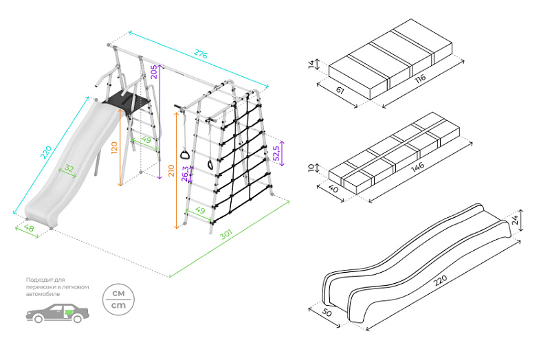 В наборегорка, кольца, веревочный лаз, гимнастическая лестница, неподвижный турник, качели гнездо