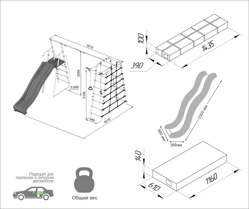 В наборегорка, кольца, веревочный лаз, гимнастическая лестница, рукоход, неподвижный турник, качели фанерные