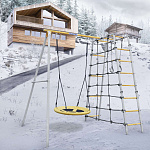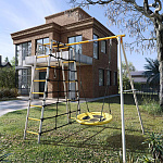 Дачный комплекс поставляется в комплекте с кольцами с перекладиной, сеткой для лазания и качелями-гнездом. Это позволяет детям разнообразить свои игры и занятия на площадке.