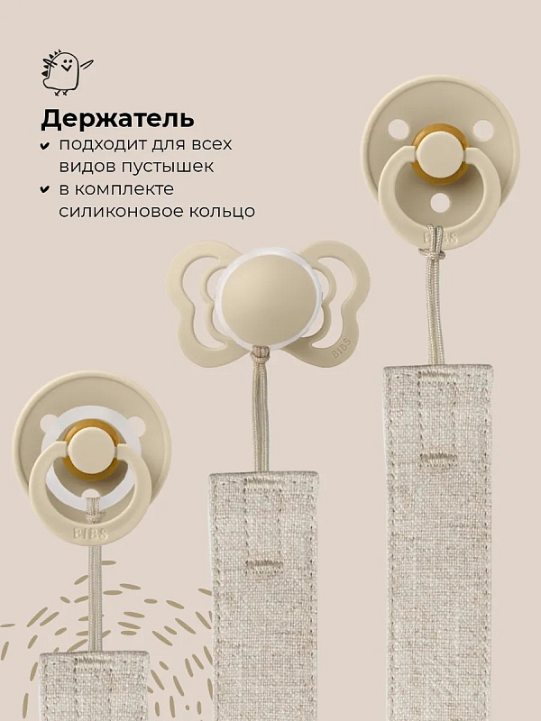Держатель подходит для всех видов пустышек – как с ручкой (например, BIBS Colour/Boheme/DeLux), так и без ручки (BIBS Couture/Supreme/Infinity). В комплекте c держателем есть силиконовое колечко, которое используется для крепления пустышки без ручки. Также держатели BUBA KIDS подходят для всех прорезывателей BIBS Baby Bitie, Mushie и прорезывателей Oli&Carol с отверстием для крепления.
