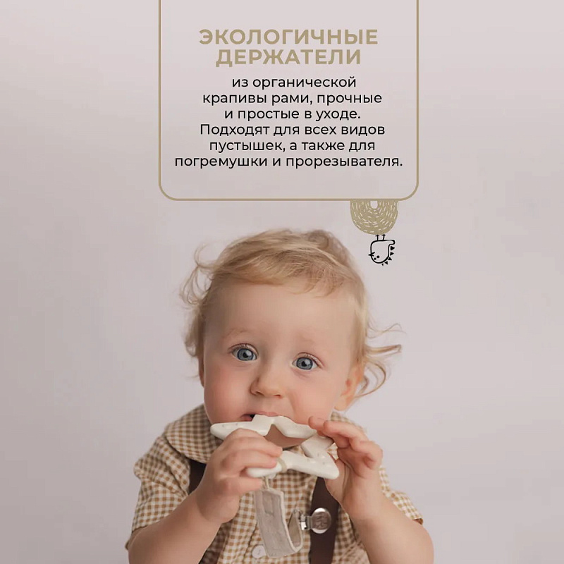 Держатель подходит для всех видов пустышек – как с ручкой (например, BIBS Colour/Boheme/DeLux), так и без ручки (BIBS Couture/Supreme/Infinity). В комплекте c держателем есть силиконовое колечко, которое используется для крепления пустышки без ручки. Также держатели BUBA KIDS подходят для всех прорезывателей BIBS Baby Bitie, Mushie и прорезывателей Oli&Carol с отверстием для крепления.