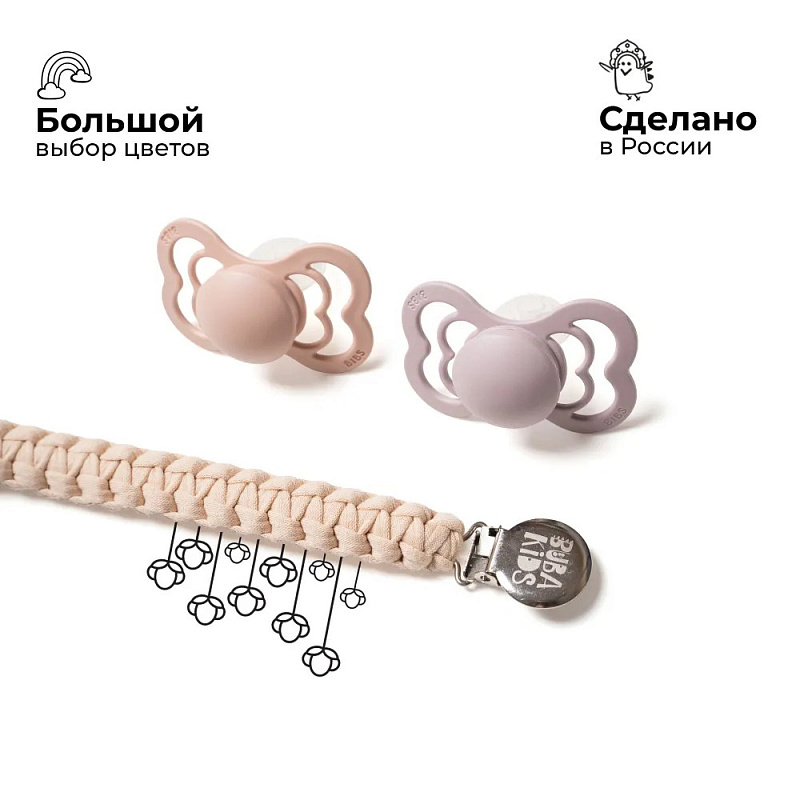 Держатели BUBA KIDS подходят абсолютно для всех видов пустышек – как с ручкой (BIBS Colour/Boheme/De Lux), так и без ручки (BIBS Couture/Supreme/Infinity). В комплекте c держателем есть силиконовое колечко, которое используется для крепления пустышки без ручки. Также держатели BUBA KIDS подходят для всех прорезывателей BIBS Baby Bitie, Mushie и прорезывателей Oli&Carol с отверстием для крепления.